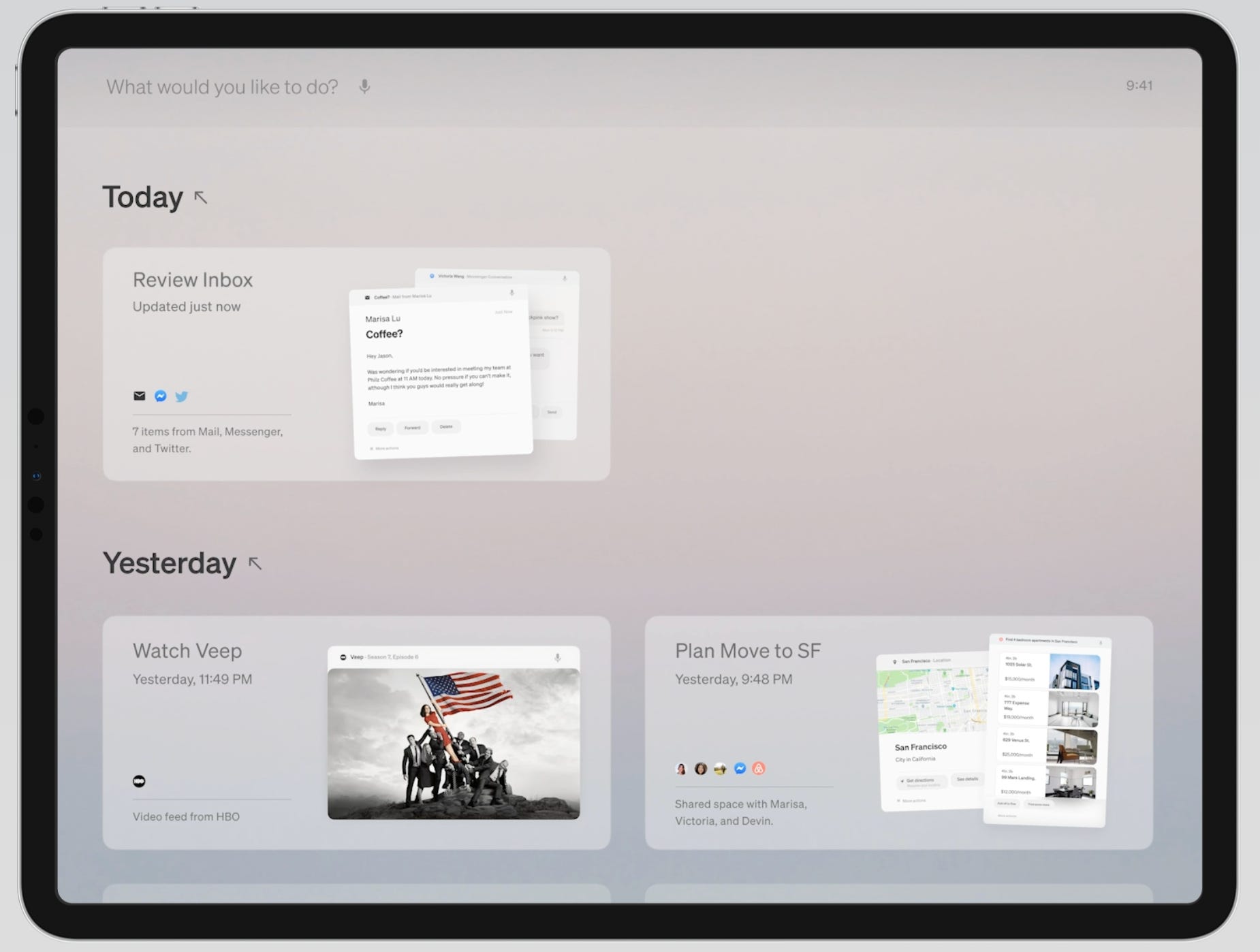 My favorite example from 2019 is MercuryOS by Jason Yuan. MercuryOS is a speculative OS that rejects the desktop metaphor and app silos, and opts to assemble content and actions fluidly around user intentions. The best way to get a feel for the ideas here is to check out the site.
