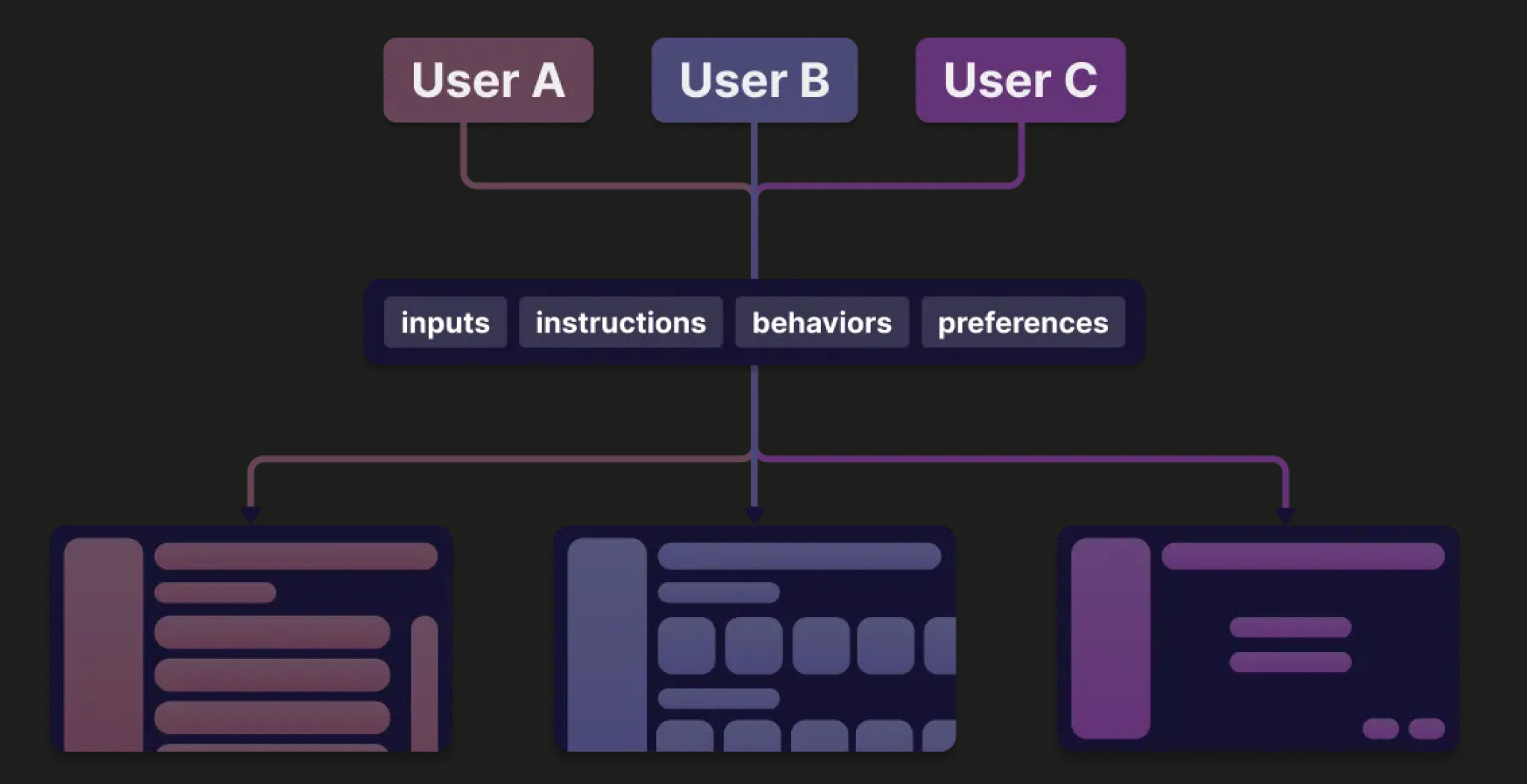 Unlike AI-aided design, where models help designers, the system itself produces the components, layouts, flows, and styling in response to context about the user. It bases the final design on the inputs, instructions, behaviors, and preferences of the user, so each user’s UI looks different.