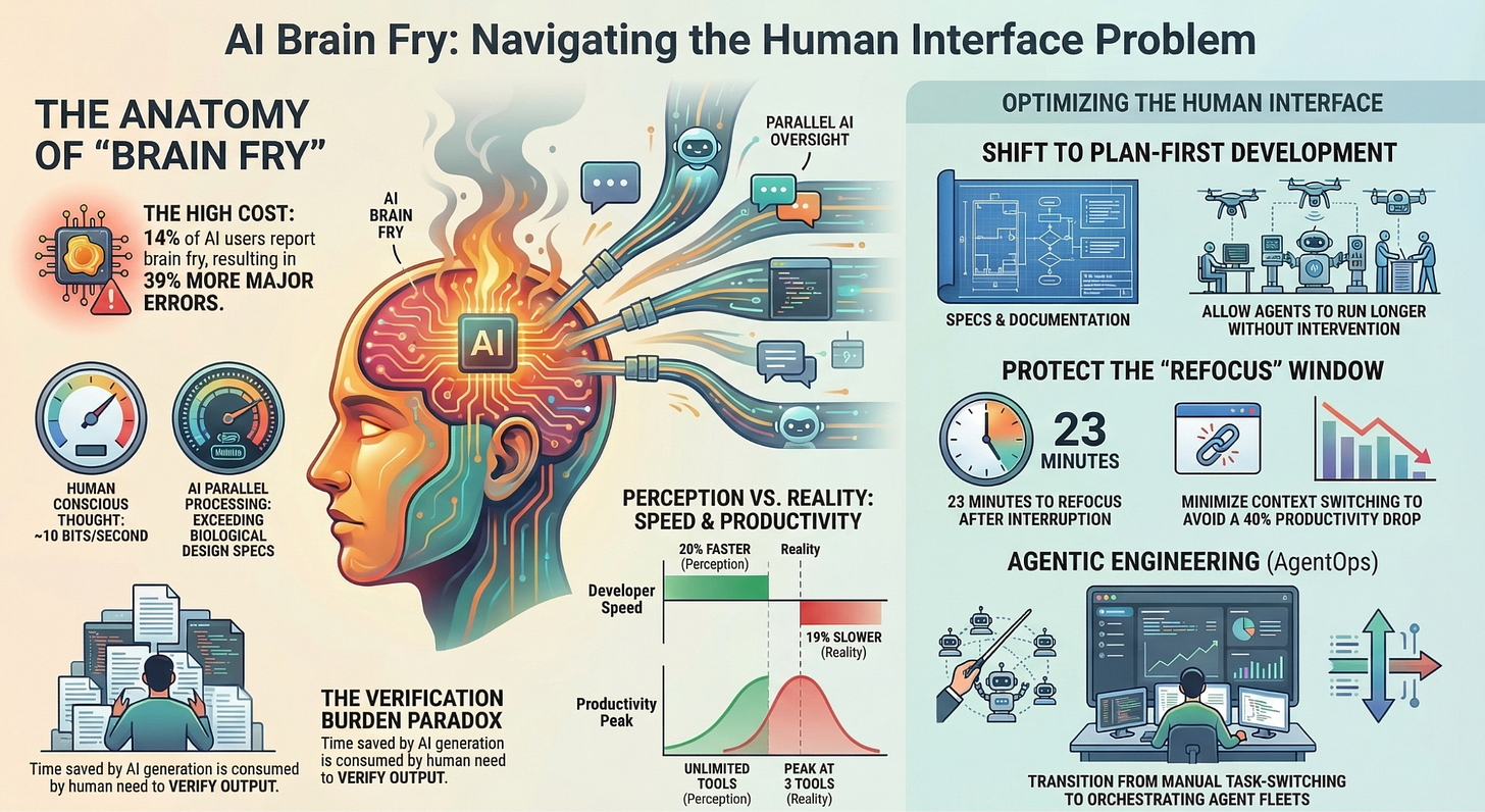 We’re all familiar with decision fatigue, but the new paradigm for interacting with this technology has redefined what that can look like. It seems obvious, but more constant context switching leads to more errors for humans. Boston Consulting Group and Harvard Business Review published a rigorous study on this in March 2026, surveying 1,488 full-time U.S. workers. 14% of AI users report brain fry. Those experiencing it show 33% higher decision fatigue and 39% more major errors.