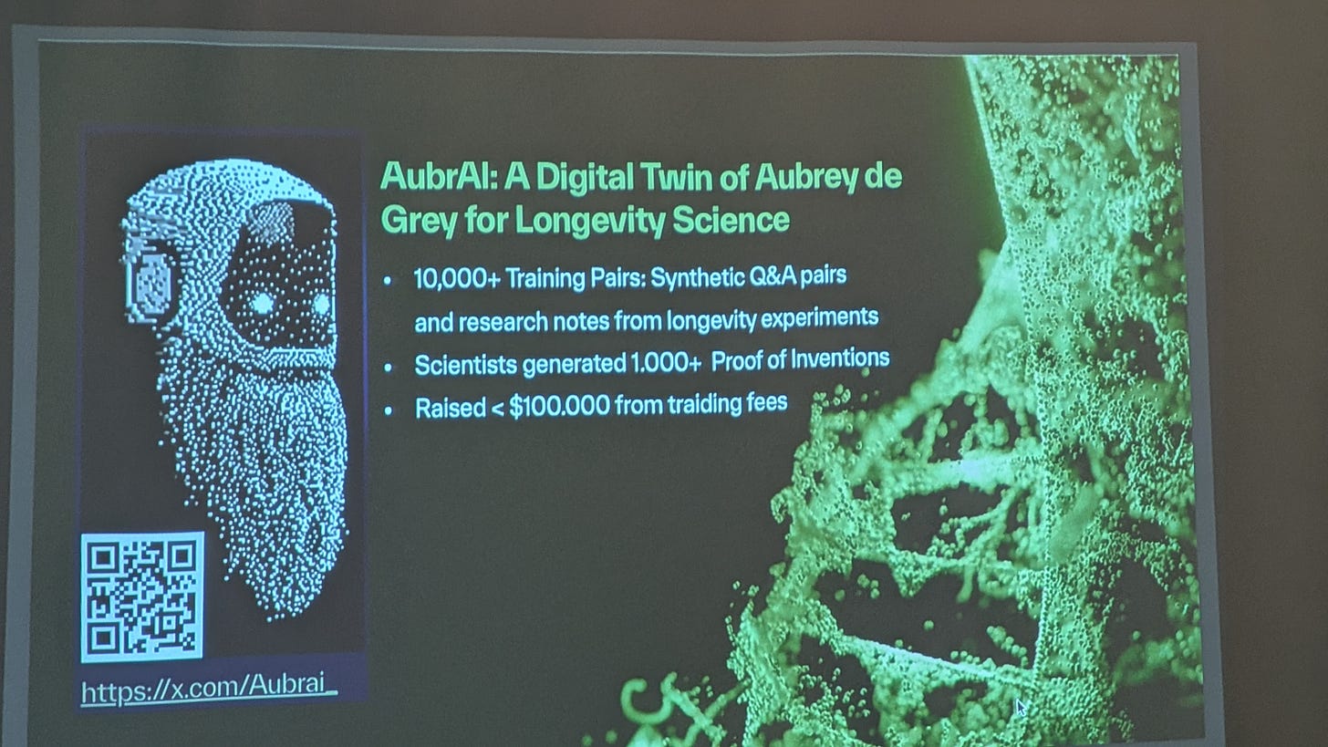 One fun thing from Molecule’s talk: AubrAI. A digital twin of the famous longevity research scientist Aubrey de Grey, trained on talks and research notes by Aubrey. Check it out here: https://x.com/Aubrai_. You can go to the site and read up on hypotheses the AI has come up with. Bio.xyz has a market tracker for agents and DAOs within the DeSci space.