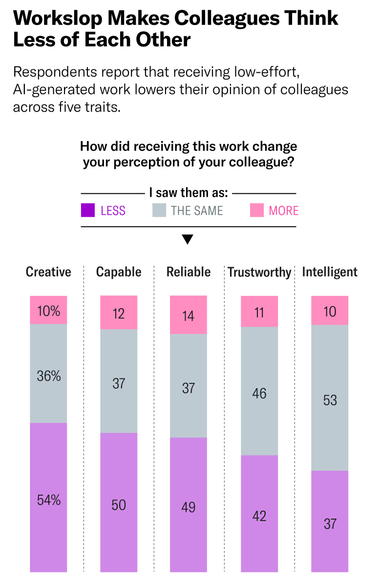Workslop erodes trust and collaboration, making colleagues appear less capable and discouraging future teamwork.