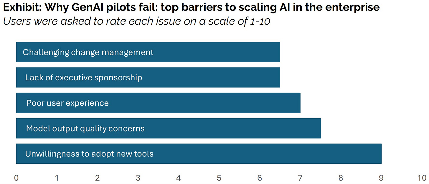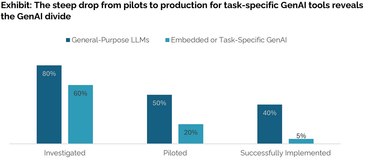 The GenAI divide is real. Employee AI usage has doubled since 2023 (from ~21% to 40% according to Gallup). But the most recent studies coming out of MIT and BetterUp are clear; so far, companies heavily investing in fully AI-led processes are seeing no discernible ROI.