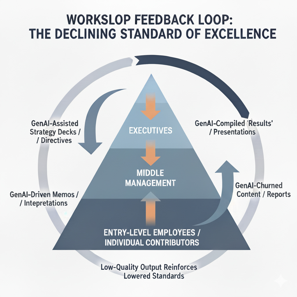 Individual Contributors and Entry Level Employees → Receive directives from middle management that are digestible, but often vague or lacking in substance. Consciously or not, they notice the dip in quality, and begin to use GenAI to churn out content, reports, code, and presentations.
